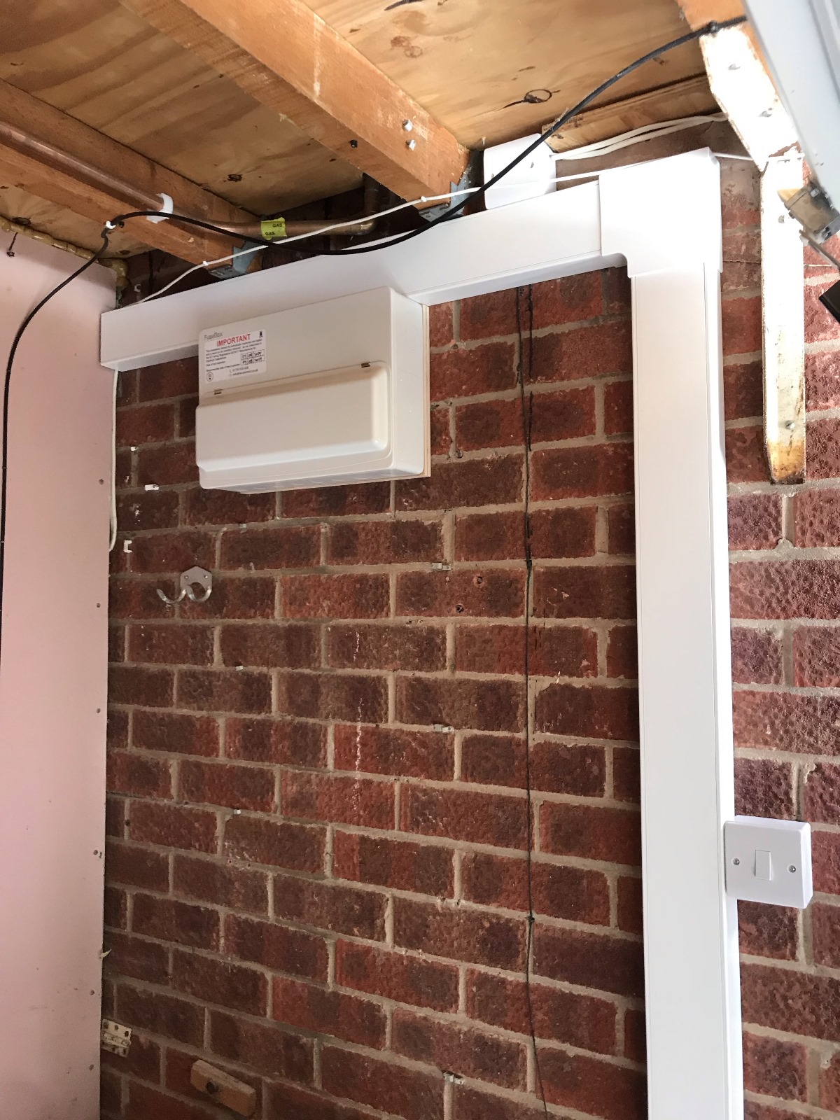 Because of this upgrade the home electrics are safer now with RCD protection on all circuits in the house. The new consumer unit was located on the garage wall instead of in the hallway cupboard and all electrical cabling was safely contained within new plastic trunking.